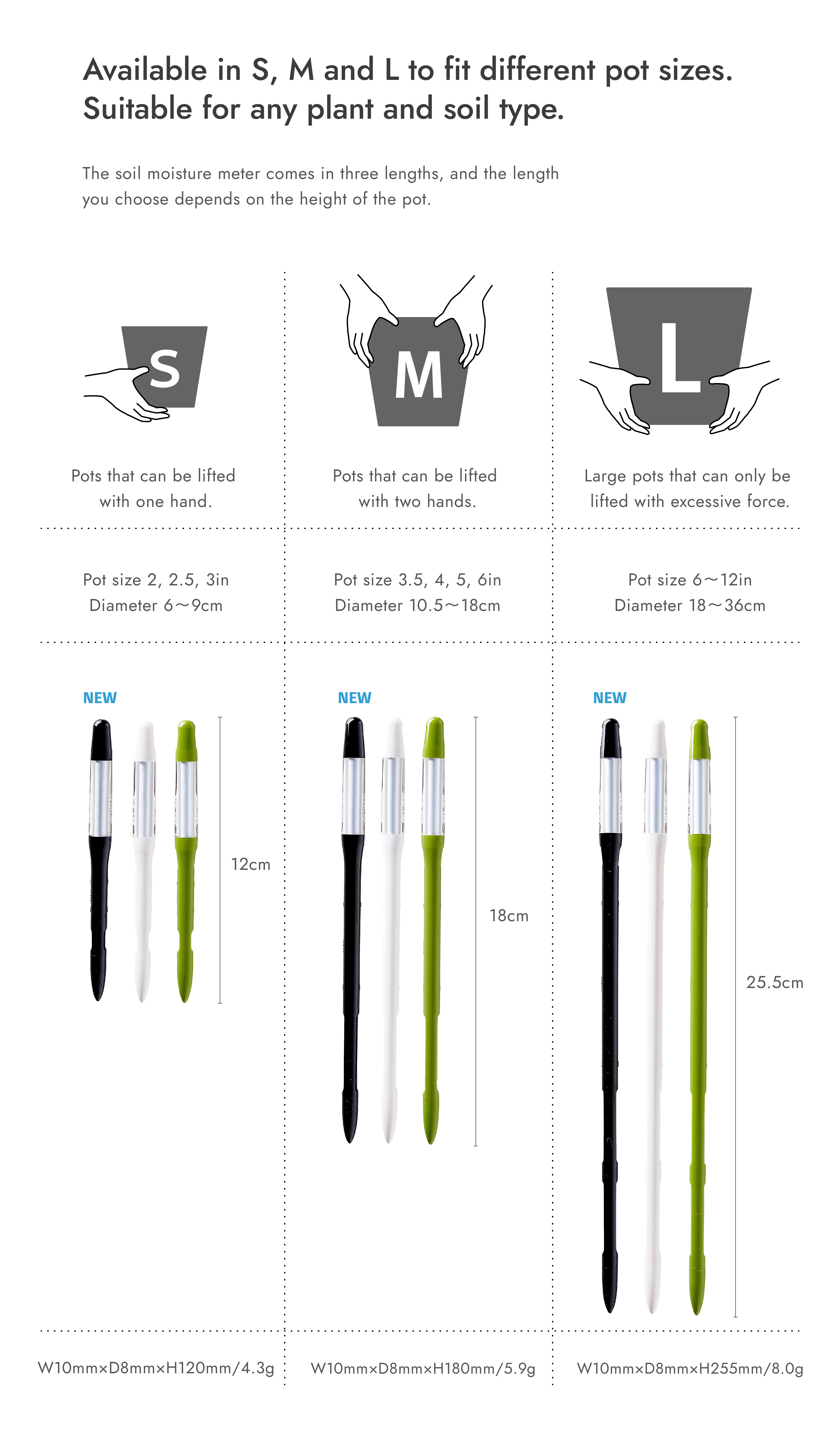 Includes S*1 / M*3 / L*1 all in one set—perfect for testing across small tabletop pots to medium and large planters, helping you easily find the most suitable soil moisture meter.