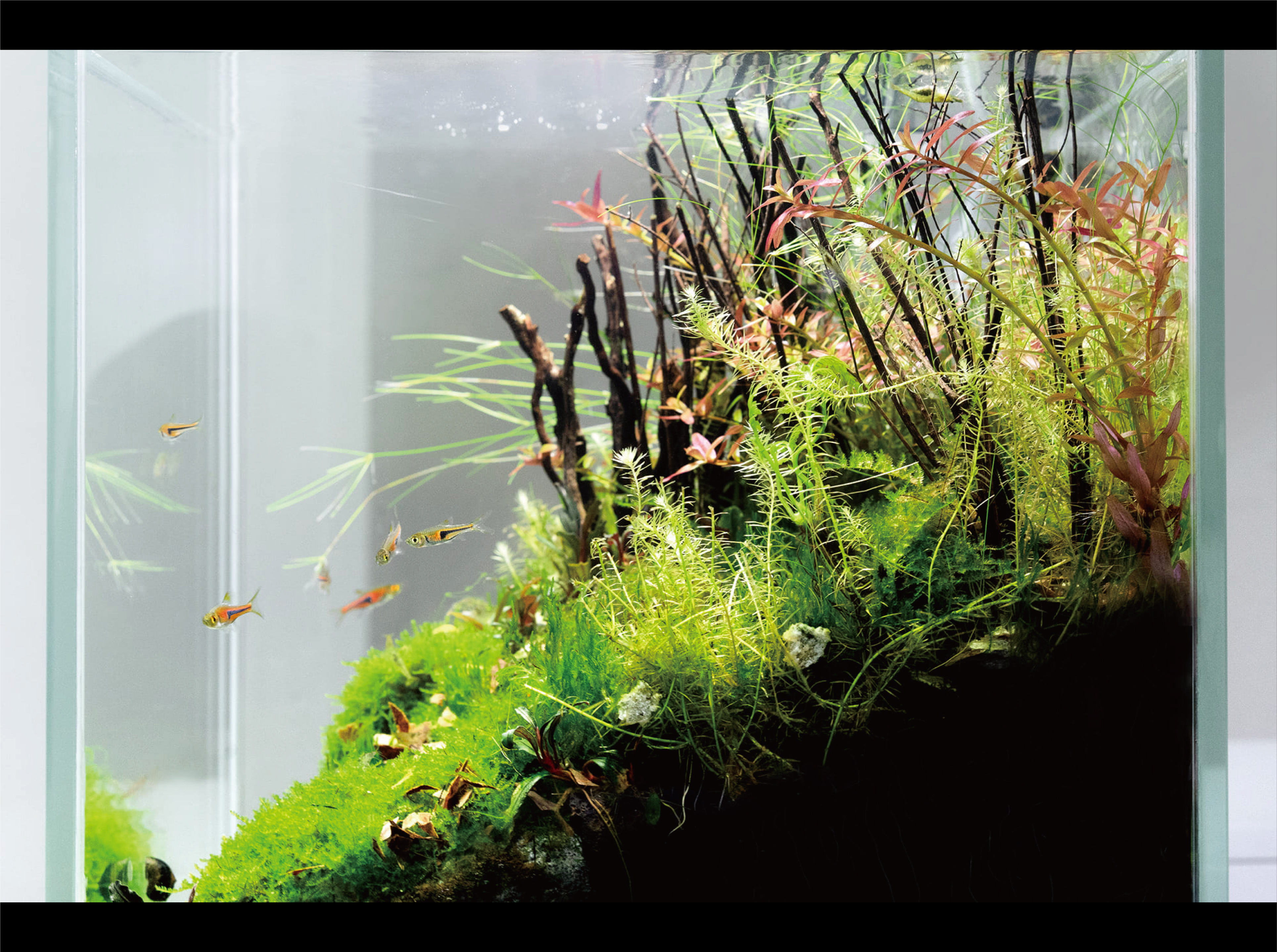 這次使用新的LED燈具,光源有四段式輸出,我全程採用100%輸出模式,缸壁的藻類卻沒有出現常見的綠斑藻,表示這次維護的管理與光源搭配很好。這盞ONF FLAT NANO LED燈除了外觀設計很新潮,水草種植效果也不錯,在第一次設計這麼小型缸的我,是一次很好的經驗。