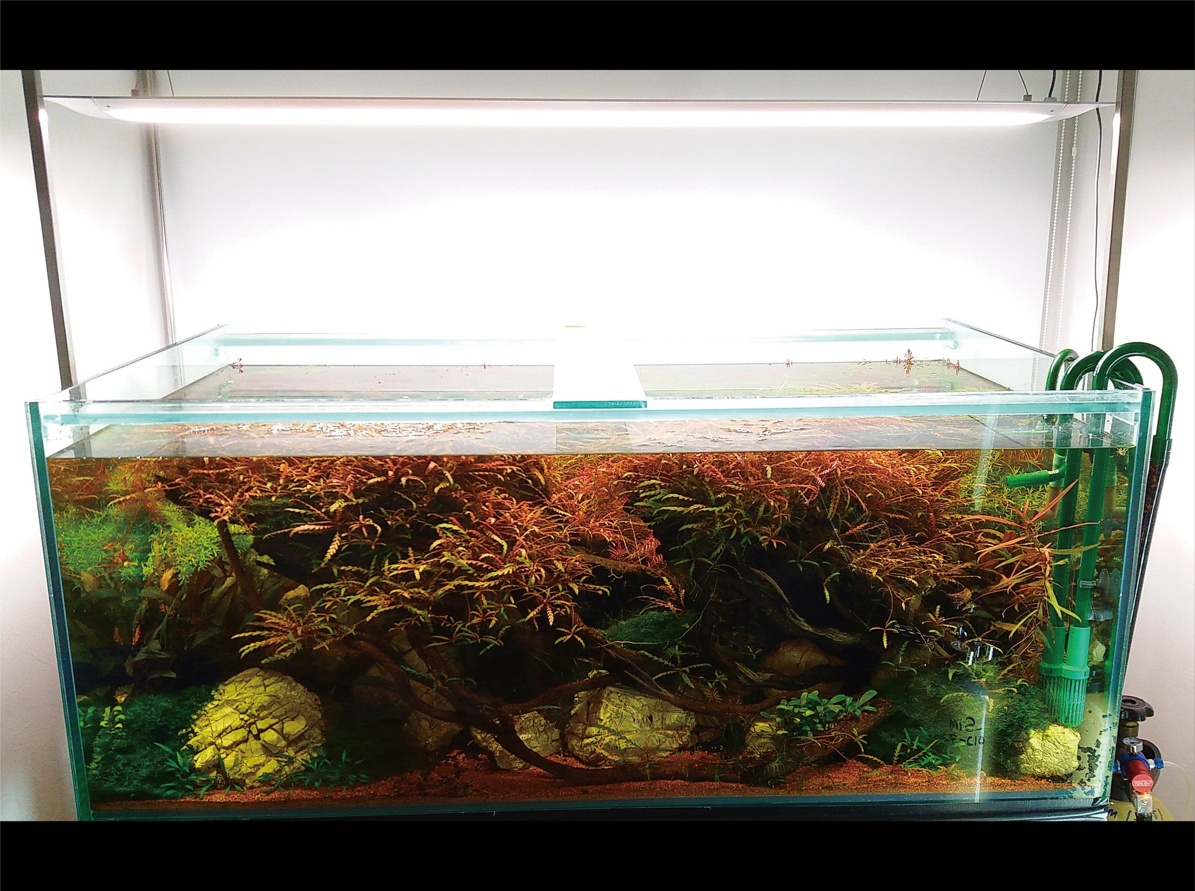 在一次機緣巧合之下, 使用了Flat One LED,第一次感覺到'ColorFull' LED的威力, 也太強了吧!在完全沒準備之下, 一盞3尺的Flat One讓我的90cm 缸史無前例的狂暴藻, 我從來沒見過那麼多的藻!看來T5 和 LED 還是在使用上有不同的方法, 需要通過燈照時間, 換水次數/容量,及 液肥的控制來調整。然後在慢慢的研究下, 開始學習如何調整LED的使用, 也看到它的超強穿透力及讓水草髮色的力量, 藻也不是問題了!