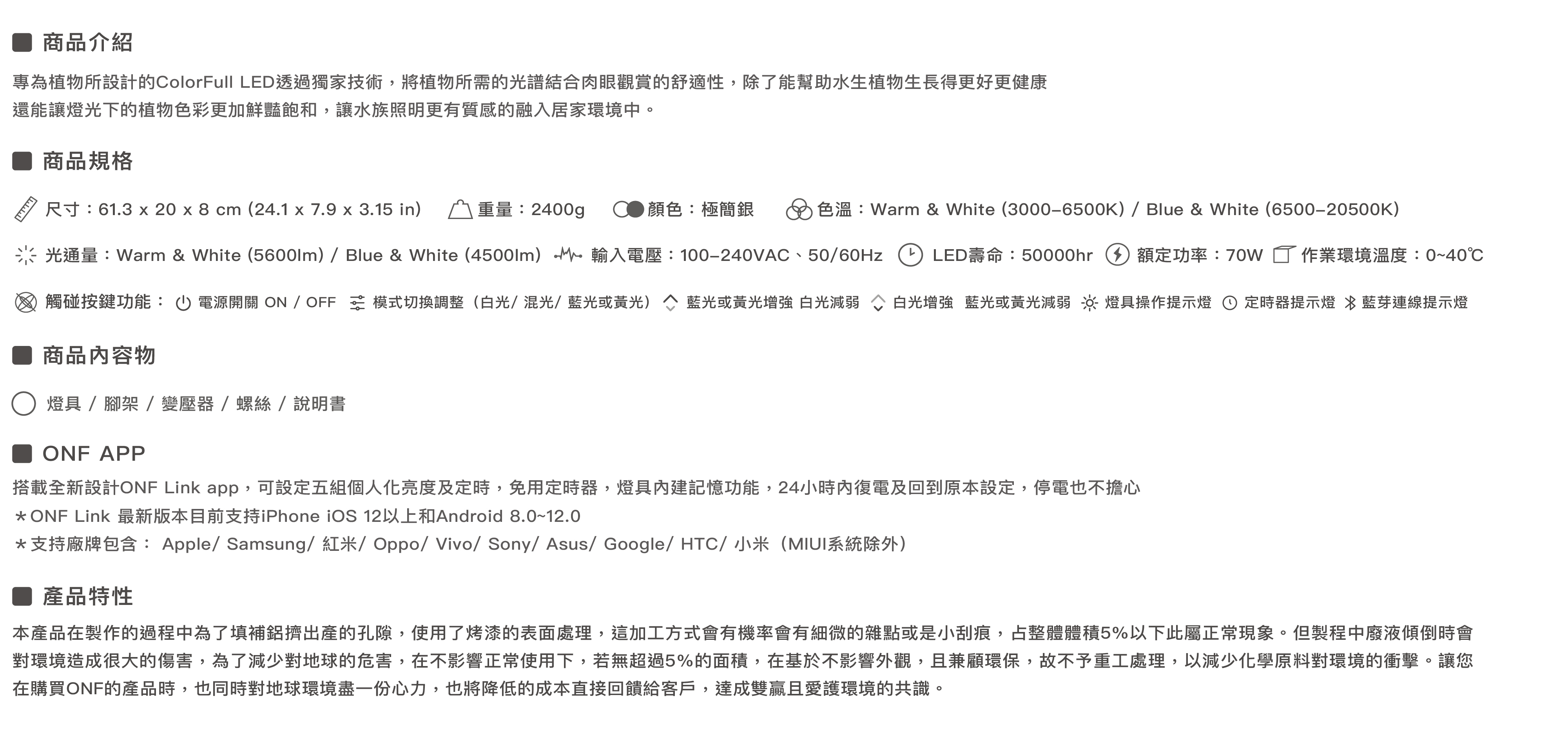 Flat One+ 是根據水族愛好者的使用習慣及動植物的生長需求所設計的智慧燈具。使用者能透過app設定五段日光循環模式,調整個人化色溫、亮度與時間,使魚缸更近一步貼近您的生活且更加節能省電。