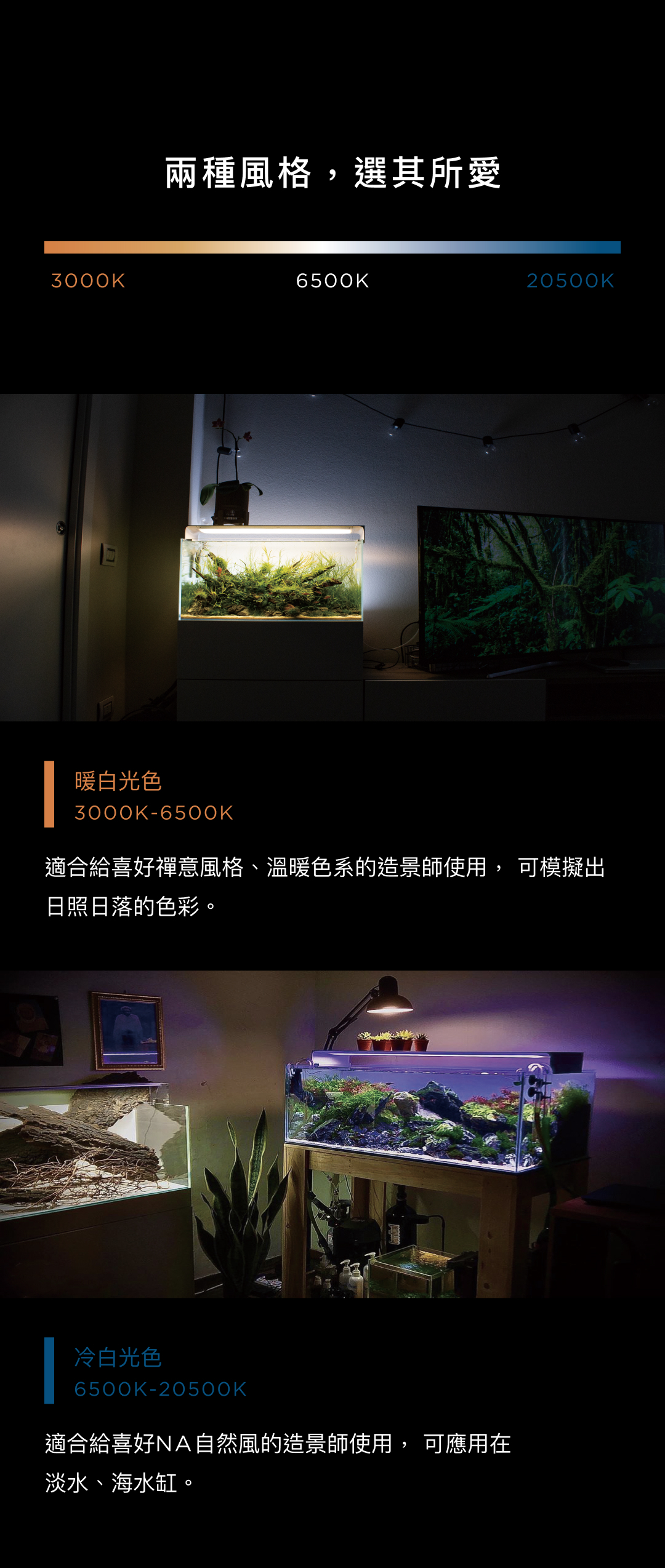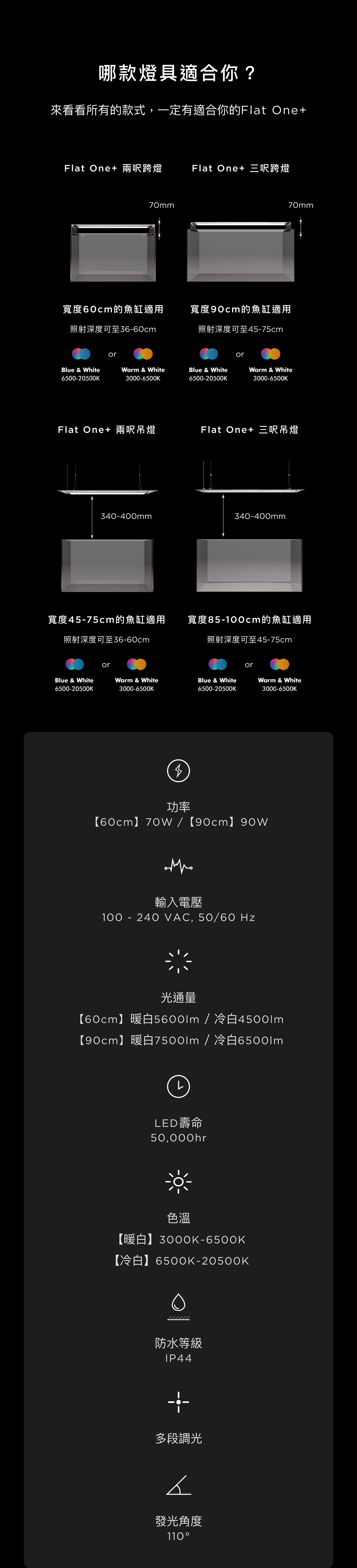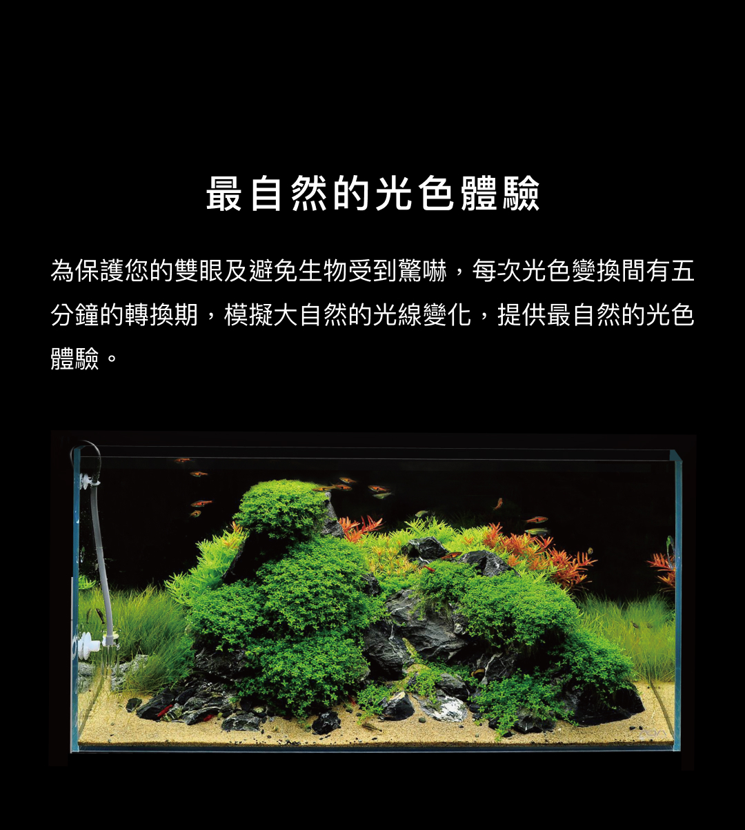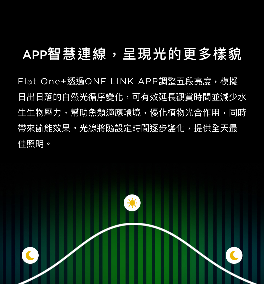 Flat One+ 是根據水族愛好者的使用習慣及動植物的生長需求所設計的智慧燈具。使用者能透過app設定五段日光循環模式,調整個人化色溫、亮度與時間,使魚缸更近一步貼近您的生活且更加節能省電。