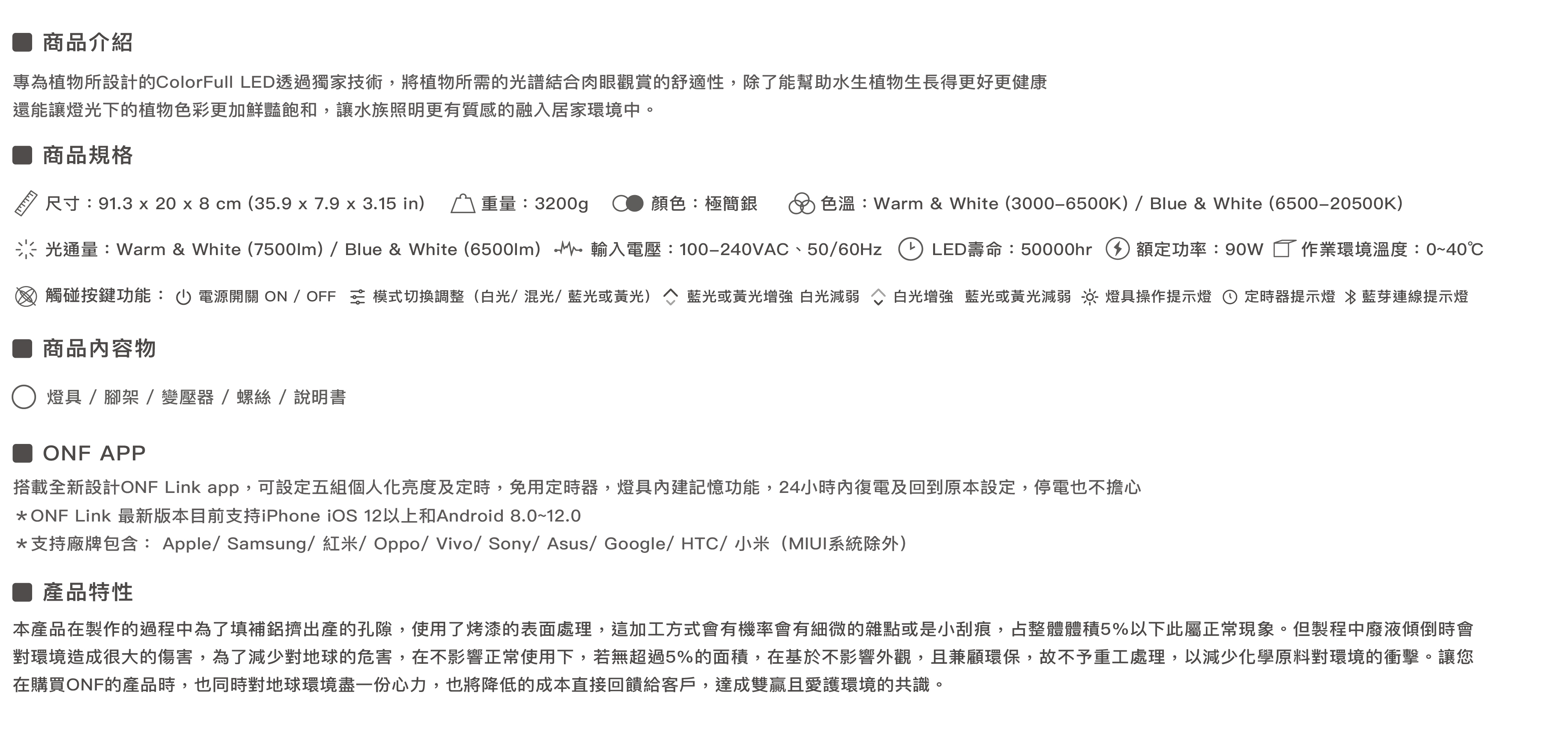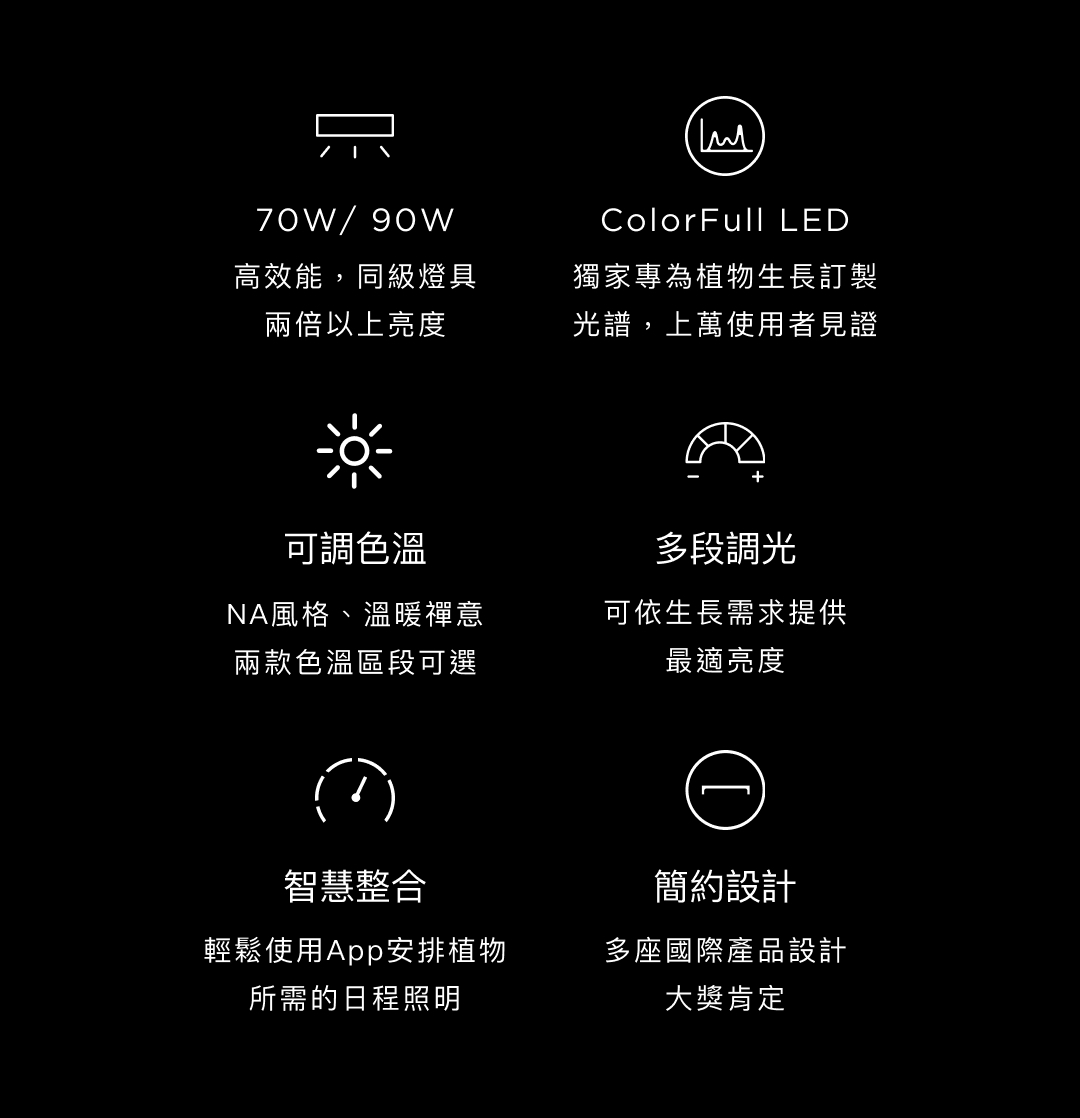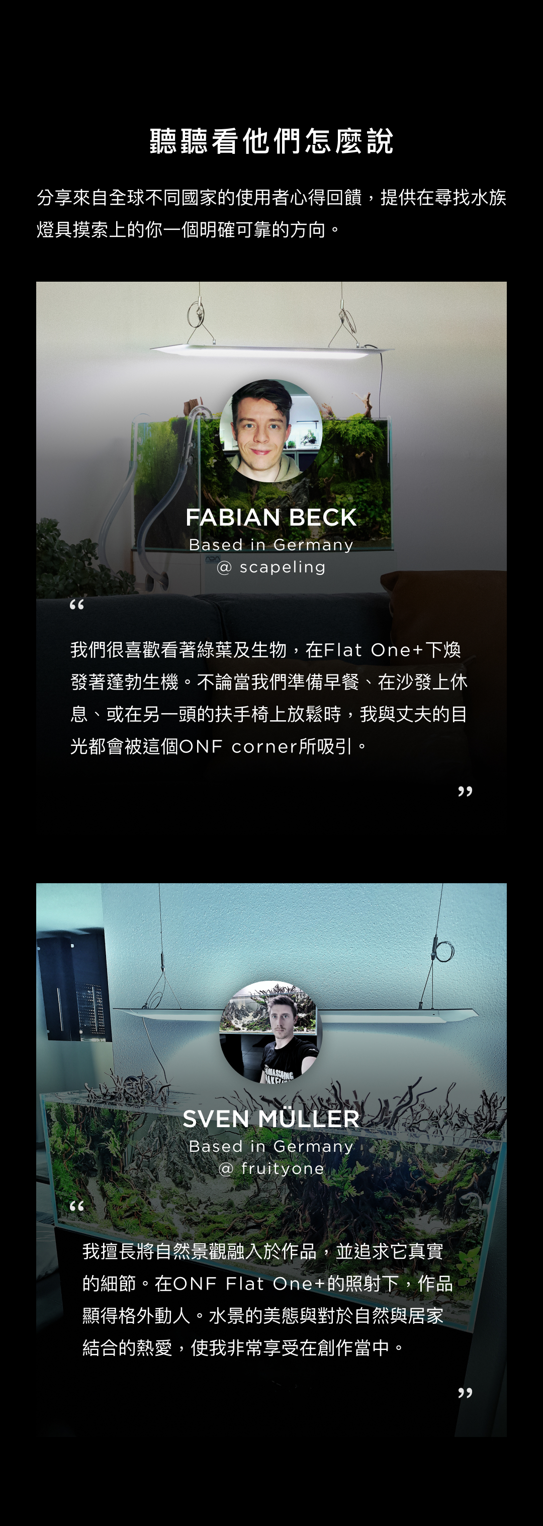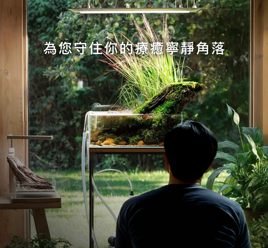 Flat One+ 是根據水族愛好者的使用習慣及動植物的生長需求所設計的智慧燈具。使用者能透過app設定五段日光循環模式,調整個人化色溫、亮度與時間,使魚缸更近一步貼近您的生活且更加節能省電。