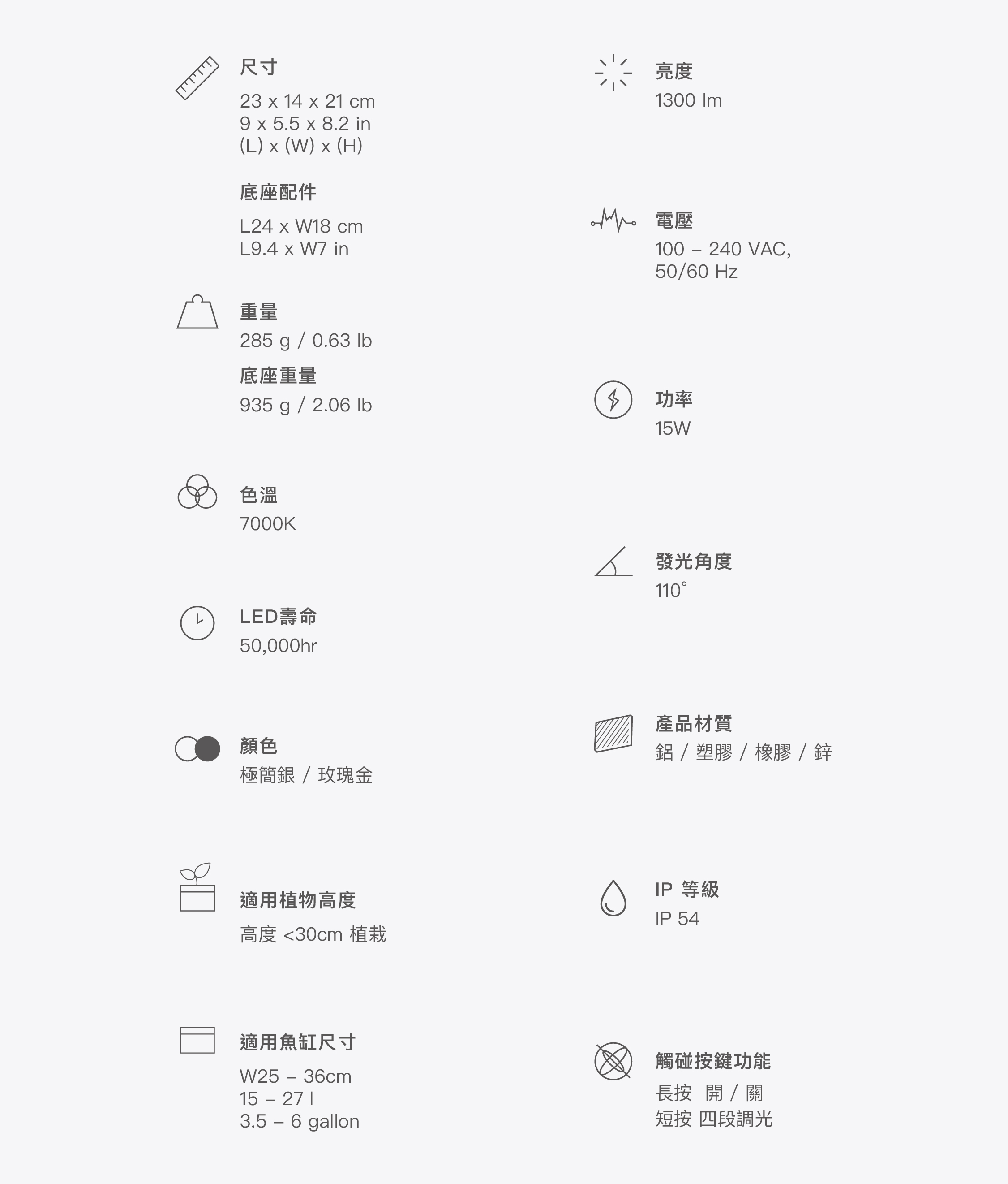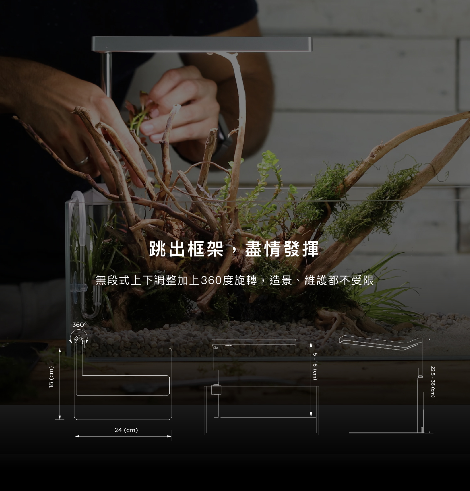 .以植物的生長方式及使用者體驗為出發點,即使植物持續向上生長,可無段式升降,騰出植物的生長空間(22.5~36cm)。